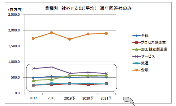 社外IT支出を業種別にみる。加工組立製造業の2019年度予算の伸びが前年度28.4%増と最も大きい。この背景には、デジタル戦略投資の拡大がある。大手企業を中心にDXが進み始めた一端がうかがえる。加工組立製造業では、2019年度にグループ標準のERP導入を予定する企業もあった。今後3年間でIT投資を増加させるソフトウェアの上位3つはERP、セキュリティ関連ソフト、KMおよびCAD/CAM(同率)であった。また、今後3年間のIT投資の目的には、システム基盤全体の効率化、情報セキュリティの強化、工場の生産性向上が挙がっている。