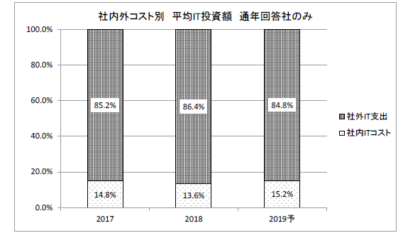 2017~2019年度予算の社内コストおよび社外IT支出の構成比をみる。社内ITコストが15%程度、社外IT支出が85%程度という状態が続いている。