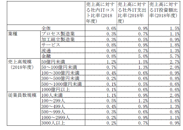 売上高に対するIT投資比率をみる。売上高に対するIT投資額比率(2018年度)は、全体平均1.5%程度となっている。業種別にみると、金融業が5.7%と最も大きい値を示す。