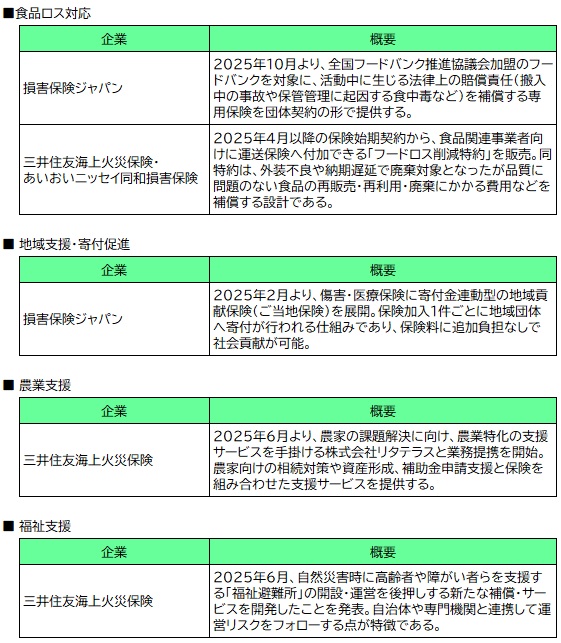これらの事例に共通するのは、保険が単なるリスク補償ではなく、社会課題の解決に向けた“仕組み”として設計されている点である。保険会社が制度設計者としての役割を担い、社会的価値を創出する姿勢が鮮明になってきている。