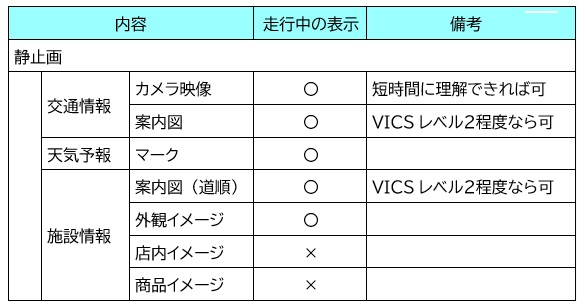 【図表:静止画における走行中の表示可否】