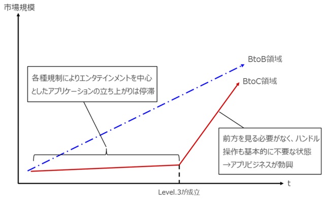 こうした状況になって初めて、安心・安全を保ちつつ、エンタメなどのアプリケーションに興じたり、運転手自身が走る車内で仕事ができる状況が成立するといえよう。そうした状況が成立したことを契機に、エンタメを含めたアプリケーションによるBtoC領域が日本において立ち上がり始めるものとみる。